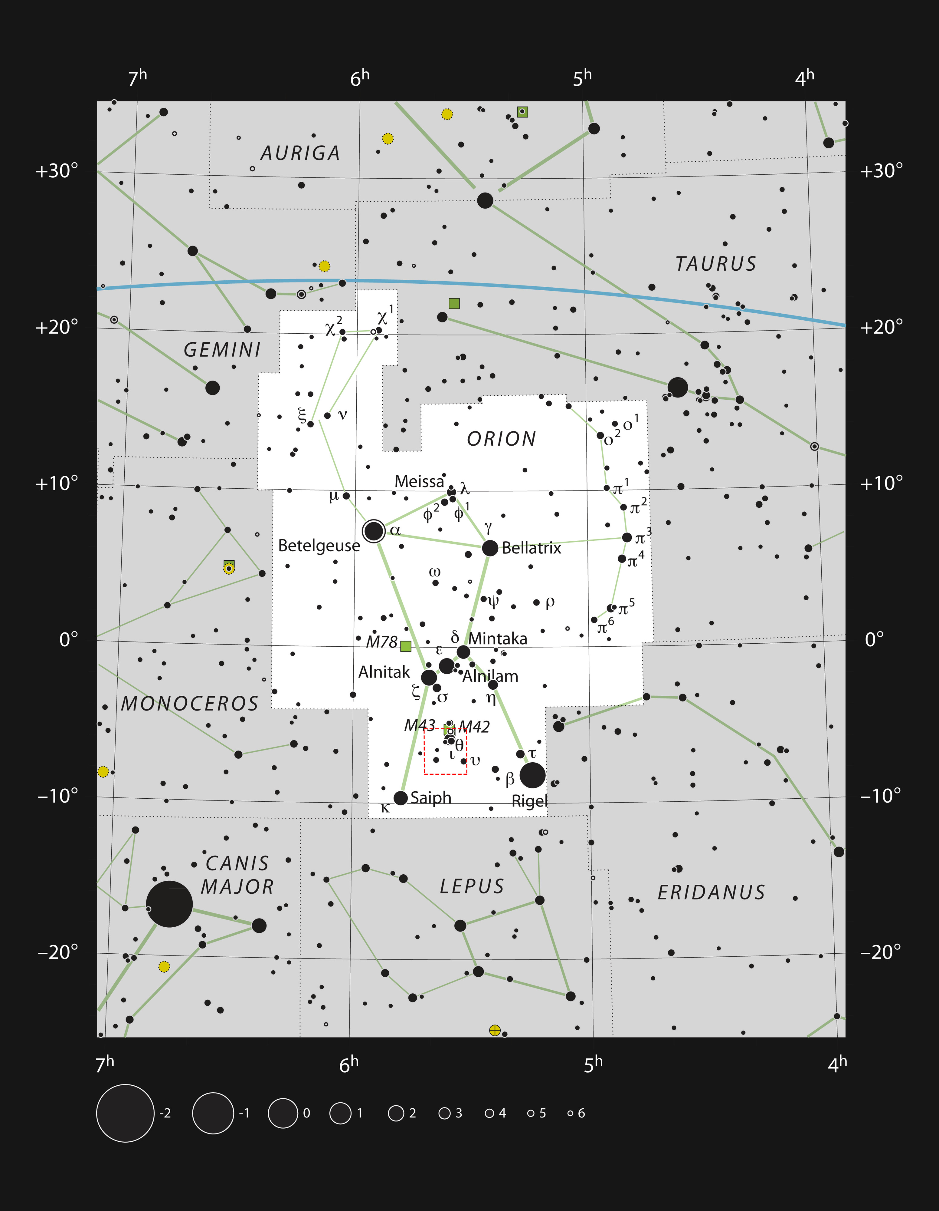 Este mapa muestra la conocida constelación de Orión (El Cazador). La