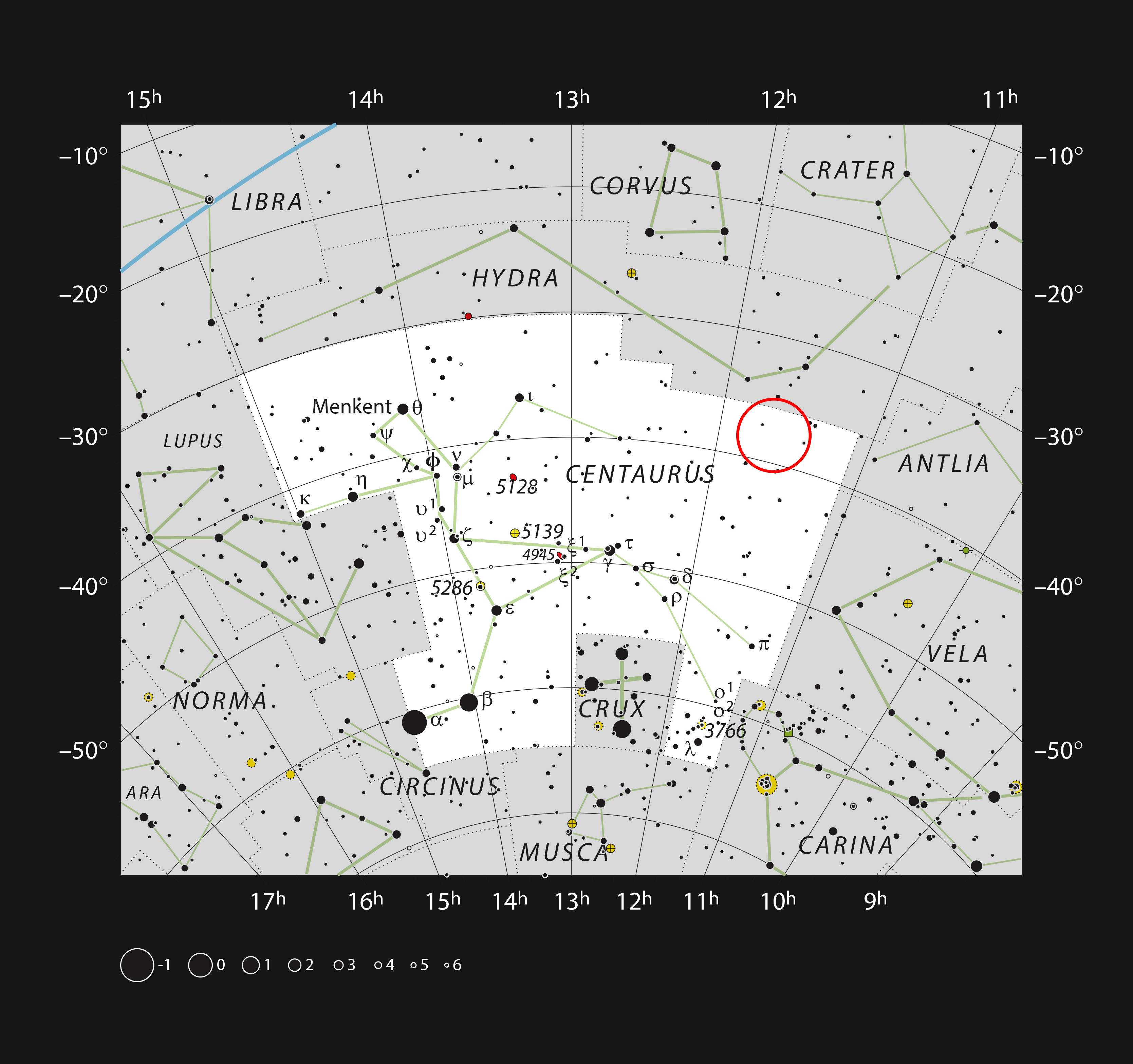 Este mapa muestra la constelación de Centaurus (El Centauro). La