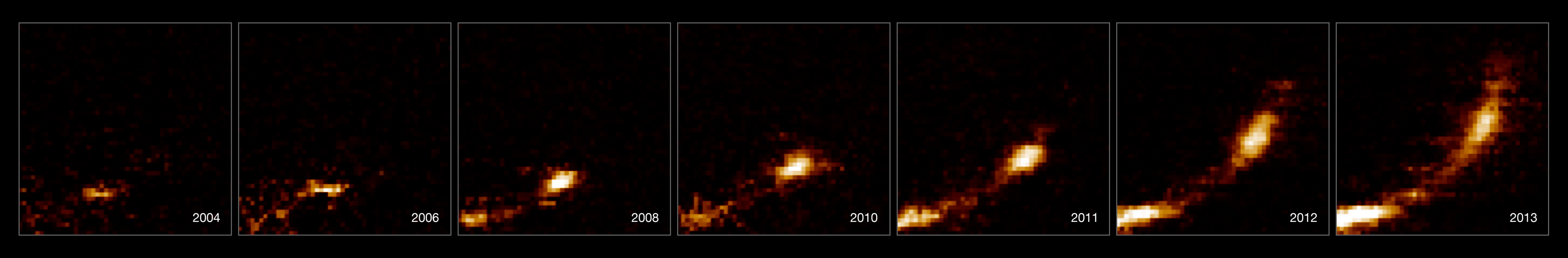 Aquí vemos observaciones del VLT llevadas a cabo en los años 2006, 2010 y 2013,